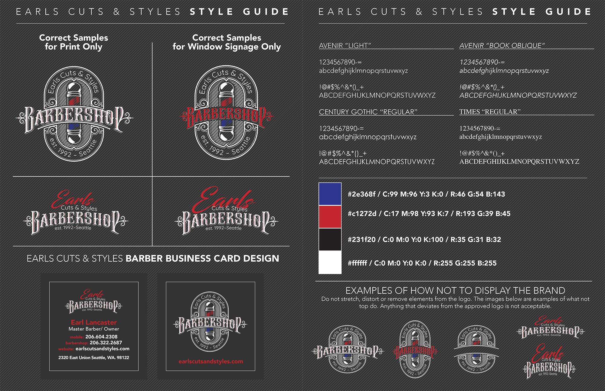 The Earl’s Cuts & Styles Style Guide provides a comprehensive framework for maintaining the brand’s visual identity. It includes specifications for typography, outlining approved fonts such as Avenir (Light and Book Oblique), Century Gothic (Regular), and Times (Regular) to ensure consistency across all brand materials.