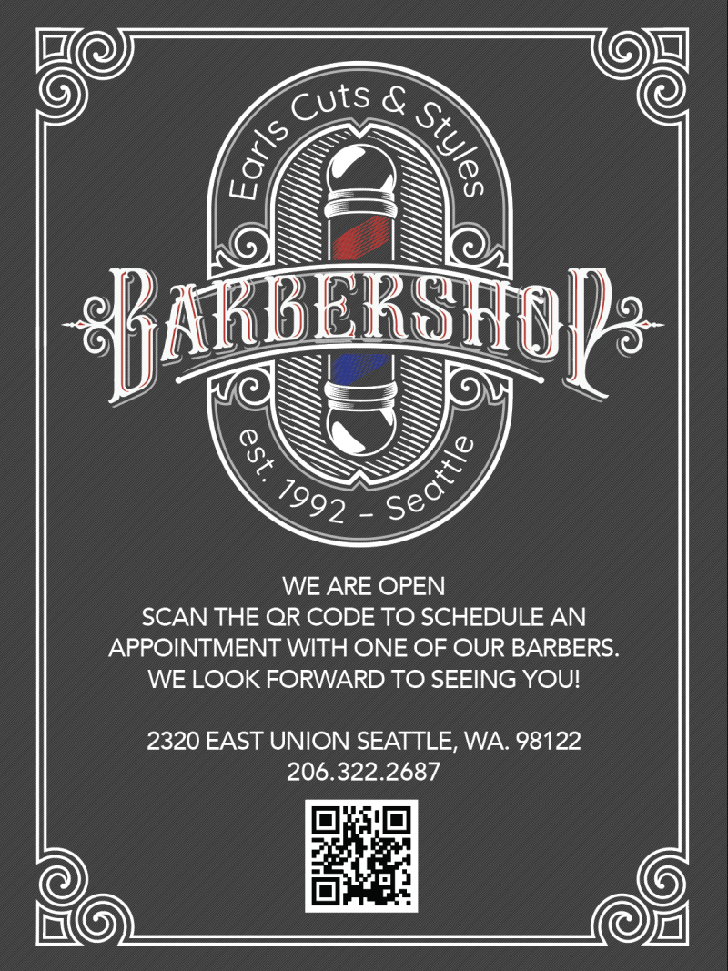 This poster for Earl’s Cuts & Styles was displayed around Seattle during COVID-19 to inform customers that the barbershop remained open. Featuring a vintage barber pole design and elegant typography, it encouraged contactless appointment booking via a QR code. This approach helped maintain business operations while ensuring safety and convenience for customers during the pandemic.