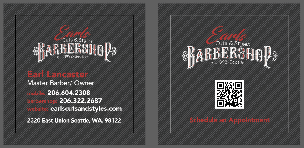 The Earl’s Cuts & Styles business card design maintains a professional and cohesive look, used by all four barbers to reinforce brand identity. Featuring a clean layout, it includes the barber’s name, contact details, and the shop’s location in Seattle. The design follows the shop’s official style guide, using approved fonts and colors for consistency. This uniform approach ensures brand recognition and a polished presentation for all clients.