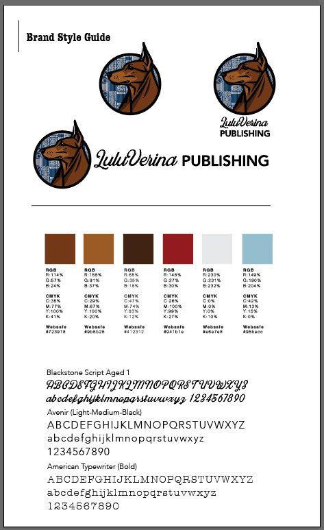 The LuluVerina Publishing Brand Style Guide establishes a cohesive visual identity for the publishing company. Featuring an elegant horse-themed logo, the design incorporates a sophisticated color palette of earthy browns, deep reds, and soft blues. The typography selection includes Blackstone Script Aged 1 for a classic, artistic touch, alongside Avenir and American Typewriter (Bold) for a modern and professional look. This branding supports LuluVerina Publishing in creating a recognizable and polished presence for its literary projects, including books like Meet Buddy Boy Royal, which celebrates the unique personality of a red Doberman Pinscher. The style guide ensures consistency across all marketing materials, reinforcing the company’s identity and mission.