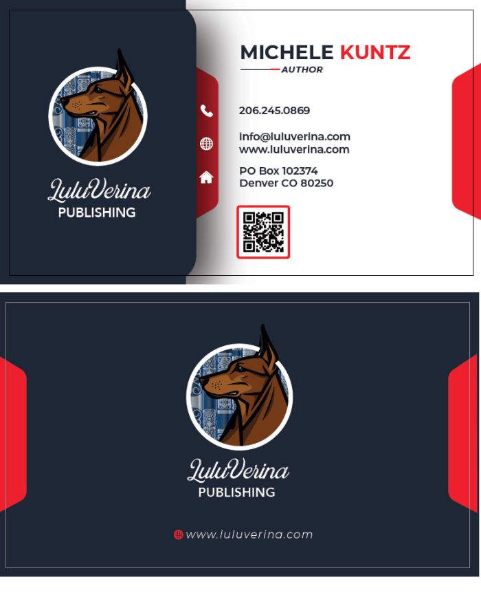 The LuluVerina Publishing business card design presents a sleek and professional look that aligns with the brand’s identity. Featuring a dark navy and red color scheme, the design incorporates the company’s signature Doberman logo, reinforcing its strong and recognizable branding. The front showcases the company’s name and website, while the back highlights author Michele Kuntz’s contact details, including a QR code for easy access to more information. This business card supports LuluVerina Publishing’s mission of bringing unique literary works to life, including Meet Buddy Boy Royal, a book that shares the story of a lovable red Doberman. The polished design reflects the company’s dedication to quality and professionalism in publishing.