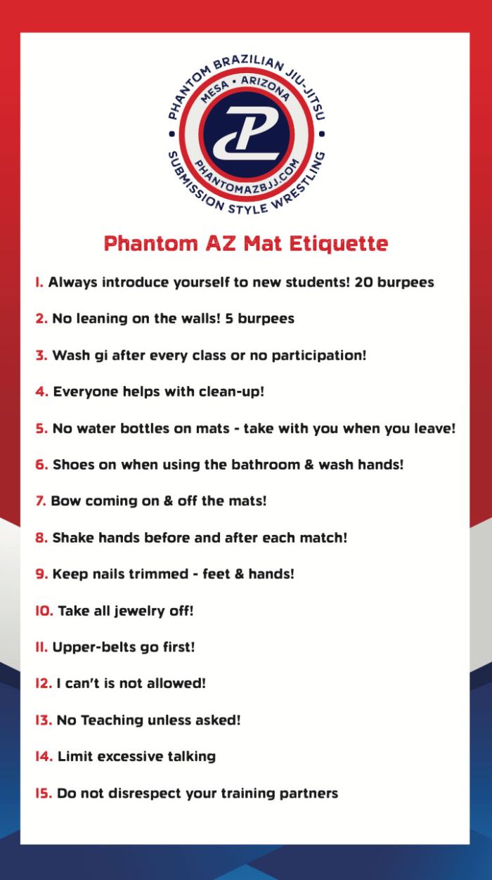 The 18×32 gym rules poster for Phantom BJJ AZ serves as a clear and professional reminder of proper mat etiquette and training expectations. Designed for high visibility, it outlines 15 essential rules to ensure respect, cleanliness, and discipline on the mats. From greeting new students and maintaining hygiene to respecting training partners and limiting distractions, this poster reinforces the gym’s values and culture. Its bold, structured layout makes it easy for students of all levels to follow, helping to create a positive and disciplined training environment.