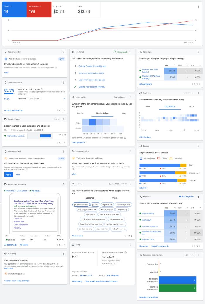 The Google ad campaign for Phantom BJJ AZ utilized a mix of PPC search ads and engaging video ads in multiple sizes to maximize reach. PPC ads targeted martial arts enthusiasts and locals searching for Brazilian Jiu-Jitsu training, driving traffic to the website and increasing sign-ups. The video ads highlighted Phantom BJJ AZ’s expert instruction, welcoming atmosphere, and real student testimonials, creating strong brand awareness and engagement. This multi-format approach ensured high visibility and strong conversion rates across Google’s ad network.