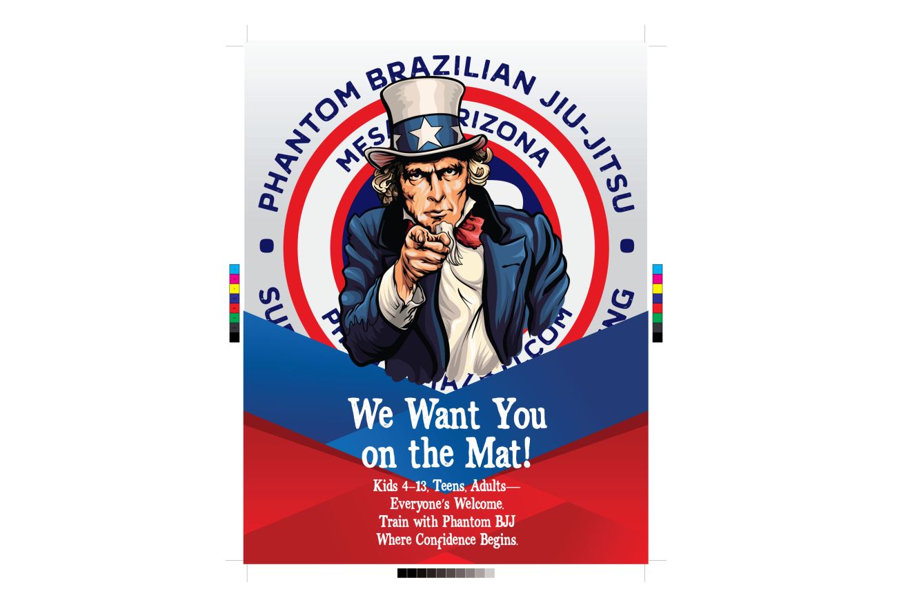 The Phantom Brazilian Jiu-Jitsu posters put a fresh spin on the classic “Uncle Sam” design with the rallying call: “We Want You on the Mat!”. Bold, patriotic colors and the Phantom BJJ emblem frame the message of inclusion and empowerment, inviting kids, teens, and adults to train. The design emphasizes confidence, strength, and community, making it clear that everyone is welcome to begin their journey at Phantom BJJ.
