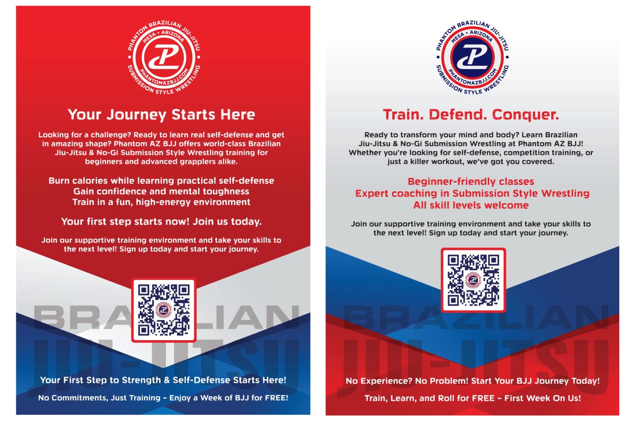 The Phantom Brazilian Jiu-Jitsu posters highlight the academy’s commitment to self-defense, fitness, and personal growth. Featuring bold headlines like “Your Journey Starts Here” and “Train. Defend. Conquer.”, the designs emphasize beginner-friendly classes, expert coaching, and a welcoming environment for all skill levels. With striking red, white, and blue branding, motivational messaging, and QR codes for easy sign-ups, the posters inspire newcomers to take their first step on the mats and join the supportive Phantom BJJ community.