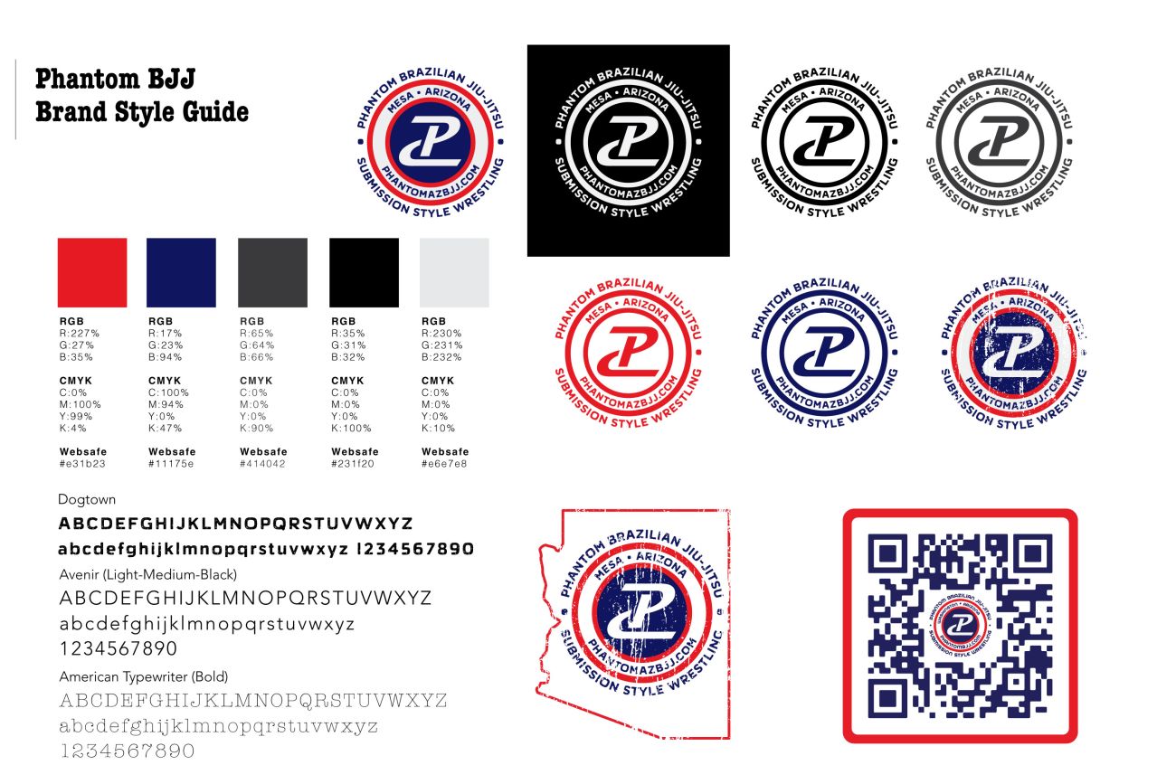 The Phantom BJJ Brand Style Guide defines the visual identity of Phantom Brazilian Jiu-Jitsu with bold, modern design elements that reflect strength, discipline, and resilience. Featuring a patriotic red, white, and blue palette, multiple logo variations, and rugged distressed options, the guide ensures flexibility across print, digital, and apparel applications. Standardized typography, color codes, and iconography maintain consistency, while unique elements like the Arizona state outline and branded QR code reinforce Phantom BJJ’s strong local roots and professional presence.