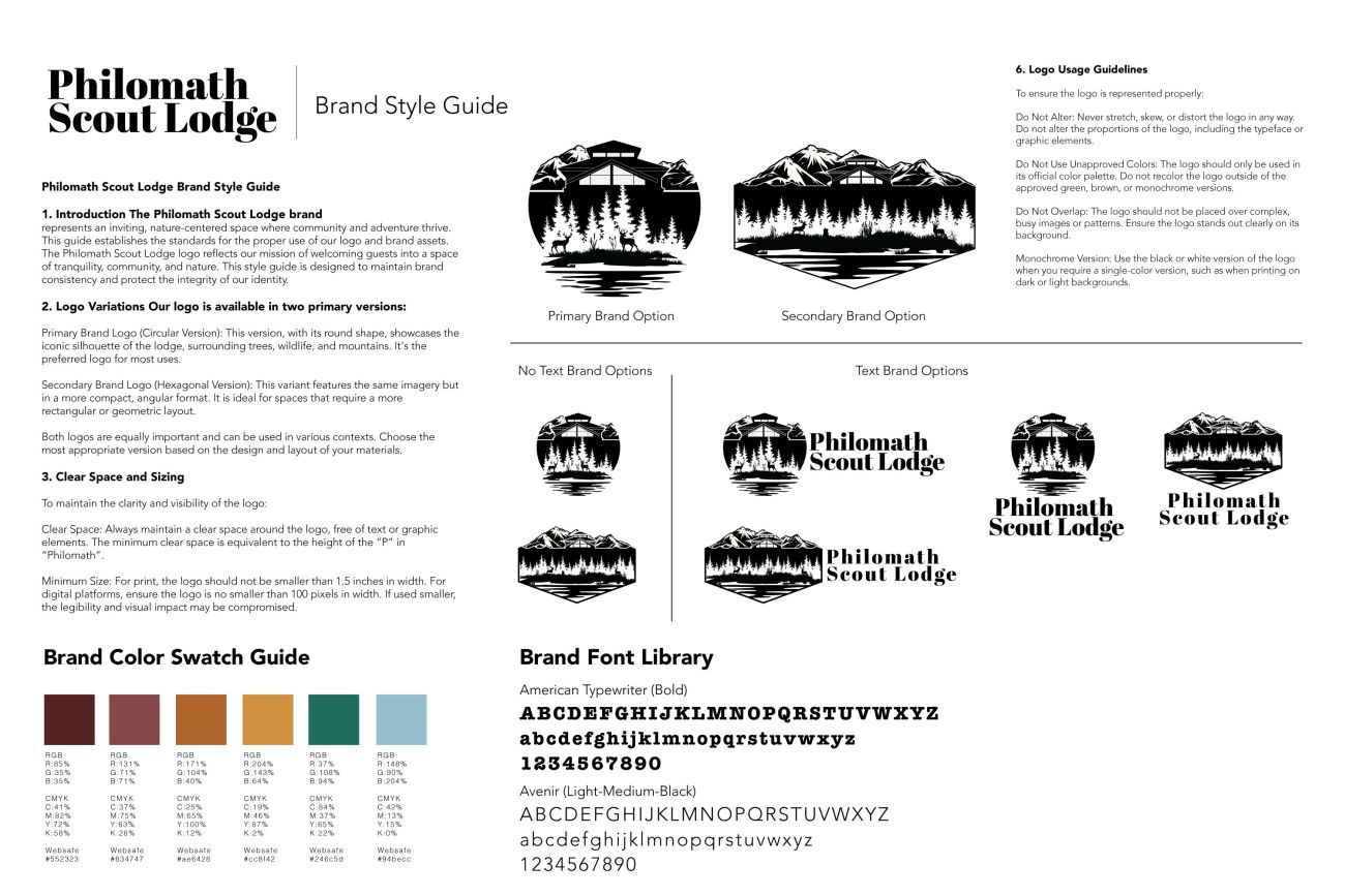 The Philomath Scout Lodge Style Guide establishes a consistent visual identity that reflects the lodge’s values of community, leadership, and tradition. It outlines standards for logo usage, colors, typography, and supporting design elements to ensure professionalism across print, digital, and event materials. By following this guide, the Philomath Scout Lodge strengthens its brand presence while honoring its role as a gathering place for Scouts and the wider community.